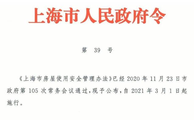 為加強(qiáng)本市房屋使用安全管理,保障公民、法人和其他組織的人身、財(cái)產(chǎn)安全,維護(hù)社會(huì)公共安全,根據(jù)相關(guān)法律、法規(guī)的規(guī)定,上海市特制定《上海市房屋使用安全管理辦法》。本辦法自2021年3月1日起施行。